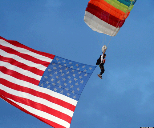 Why just be plain old patriotic when you can make a tradition larger than life? The Dolls and the Duckpond crowd sing the National Anthem while a parachuter brings the flag down over the field.